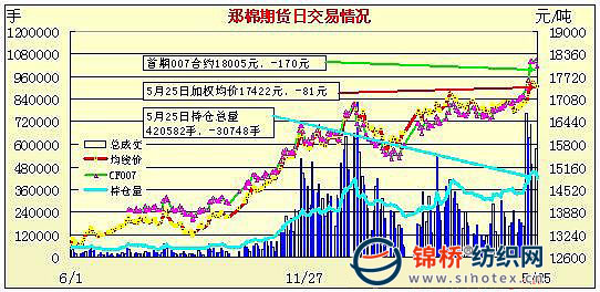5月25日,鄭棉主要合約小幅低開,CF1009合約早盤反彈后在多頭集中平倉盤打壓下一路下跌,終盤收于日低,日線形成長陰線,日內(nèi)成交量放大,持倉量大幅減少。CF1101合約早盤在多頭買盤推動下一度沖高,隨后在平倉盤的壓制下回落,午后低位盤整減倉,尾盤放量減倉收跌,日線形成1/2上影線的陰線,日內(nèi)成交量放大,持倉量減少。CF1009合約日成交326696手,日減倉22066手,終盤持倉量176736手;CF1101合約日成交242682手,日減倉7408手,終盤持倉量181634手?;久媲闆r:棉商仍看漲后期行情,幾家大型囤棉企業(yè)新疆棉報價高達18400元/噸。大部分紡企拿到棉花進口配額,所拿到數(shù)量都低于預(yù)期,但因進口棉價格也較高,紡企采購謹(jǐn)慎。同時,受棉價較高及配額發(fā)放影響,紡企整體采購較前幾天放緩,庫存較多的紡企選擇觀望。近兩日南部棉區(qū)天氣轉(zhuǎn)晴,湖南、湖北有利于棉苗移栽。