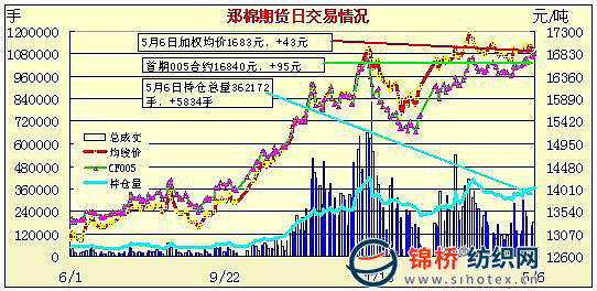 5月6日,鄭棉主要合約高開,CF1009合約早盤受到空頭恐慌回補的支撐高位盤整,午后空頭增量打壓期價收低,日線形成高開小陰線,日內(nèi)成交量萎縮,持倉量微增;CF1101早盤在多頭短線買盤的推動下上沖,隨后高位換手平倉回落盤整,午后空頭增倉打壓期價下行,終盤收于日低點一線,日線形成高開中陰線,日內(nèi)成交量變化不大,持倉量增加。CF1009合約日成交32978手,日增倉1170手,終盤持倉量139608手;CF1101合約日成交111128手,日增倉4848手,終盤持倉量147530手?;久媲闆r:現(xiàn)貨價格穩(wěn)中上漲,高等級棉日漸稀缺,紡企購買困難。日前,新疆棉二級有17600元/噸的價格成交,內(nèi)地棉三級公重提貨價16800元/噸,棉商仍持高等級棉惜售,繼續(xù)看漲后市。小紡廠見棉花漲價,陸續(xù)提高棉紗價格,原料維持隨用隨買,大紡企邊觀望邊陸續(xù)補貨。截止日前,山西、陜西、南疆棉花已出苗,安徽、江蘇棉花播種基本結(jié)束,山東、湖北、河南棉花播種正在進(jìn)行,河北、湖南棉花播種尚未大量展開。