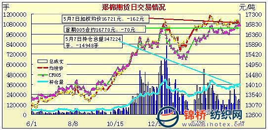 5月7日,鄭棉主要合約低開,CF1009合約早盤下探后受到空頭回補盤支撐反彈,此后窄幅整理,日線形成低開小陽線,日內(nèi)成交量放大,持倉量大減;CF1101早盤下探后在多頭短線買盤的推動下上沖,隨后盤整,午后平倉盤壓制期價回調(diào),日線形成低開陽線,日內(nèi)成交量放大,持倉量減少。CF1009合約日成交64386手,日減倉8306手,終盤持倉量131302手;CF1101合約日成交158162手,日減倉1066手,終盤持倉量146464手?;久媲闆r:近日高等級棉價格繼續(xù)上揚,紡企采購雖然很謹慎,但也在積極補庫。大部分紡企上調(diào)棉紗價格,尤其高支紗價格上漲明顯。紡織企業(yè)開始關(guān)注棉花進口配額的發(fā)放,為后期新棉上市前棉花庫存做準備。兩年一次的“中國棉業(yè)發(fā)展高峰論壇” 在海南三亞市召開,國際棉業(yè)組織、政府部門及內(nèi)外行業(yè)代表將會就當前形勢發(fā)言。