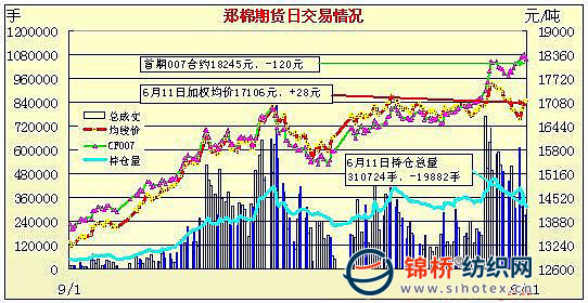 6月11日,鄭棉高開,CF1009合約在多頭逢高平倉(cāng)的壓制下走低盤整,日線形成高開陰線,日內(nèi)成交量放大,持倉(cāng)量減少。CF1101合約高開上沖后在多頭平倉(cāng)與空頭賣盤的打壓下走低,盤中低位增倉(cāng)放量,午后期價(jià)沖高震蕩,尾盤在空頭節(jié)前回補(bǔ)的支撐下收強(qiáng),日線形成長(zhǎng)1/2下影線的陽(yáng)線,日內(nèi)成交量變化不大,持倉(cāng)量繼續(xù)減少。CF1009合約日成交83790手,日減倉(cāng)10972手,終盤持倉(cāng)量104428手;CF1101合約日成交117962手,日減倉(cāng)5548手,終盤持倉(cāng)量1593980手?;久媲闆r:現(xiàn)貨價(jià)格方面再次出現(xiàn)上漲動(dòng)向,同時(shí)助漲棉商囤棉心態(tài)。俗話說外來(lái)的和尚好念經(jīng),近期現(xiàn)貨市場(chǎng)上外棉占據(jù)主角,價(jià)格相對(duì)地產(chǎn)棉便宜;但是隨著近兩天外盤上漲,外棉報(bào)價(jià)也出現(xiàn)了上漲的跡象,不算配額成本也要17000元/噸左右。因棉價(jià)太高,紡織下游產(chǎn)品消化能力有待傳導(dǎo),紗線暢銷存在隱患,紡企觀望情緒開始增加。另?yè)?jù)今日從鐵道部消息了解到,近期新疆棉出疆車皮在前期基礎(chǔ)上繼續(xù)增加。