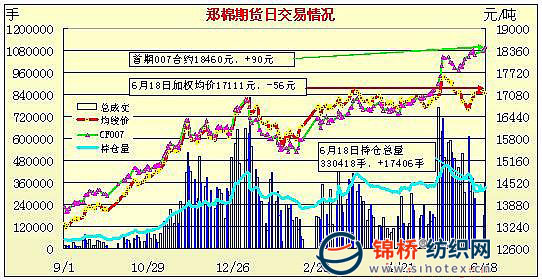 6月18日,鄭棉微幅低開,CF1009合約早盤在多頭買盤推動(dòng)下一路上行,盤中高位換手量放大,午后放量下挫,日線形成長(zhǎng)上影線的陰線,日內(nèi)成交量放大,持倉(cāng)量增加。CF1101合約增倉(cāng)盤整上試,午后在多頭平倉(cāng)盤的打壓下迅速下跌,日線形成長(zhǎng)陰線,日內(nèi)成交量放大,持倉(cāng)量增加。CF1009合約日成交104844手,日增倉(cāng)7100手,終盤持倉(cāng)量107150手;CF1101合約日成交234722手,日增倉(cāng)6234手,終盤持倉(cāng)量165586手?;久媲闆r:現(xiàn)貨價(jià)格報(bào)價(jià)出現(xiàn)小幅上漲,紡企需求以三、四級(jí)為主。棉商報(bào)價(jià)較高,囤棉惜售,市場(chǎng)成交一般。印度棉近期價(jià)格占優(yōu)勢(shì),較受紡企歡迎。大部分紡企維持隨用隨買,以觀望為主。新棉生長(zhǎng)順利,大部分地區(qū)天氣有利于棉苗發(fā)育,多數(shù)已開始現(xiàn)蕾。