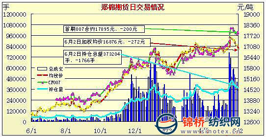 6月2日,鄭棉CF1009合約小幅低開,早盤在多頭買盤推動下回升,隨后平倉盤壓制期價減倉下行,午后觸及日低,尾盤在空頭回補的支撐下反彈,日線形成1/2下影線的陰線,日內(nèi)成交量增加,持倉量減少。CF1101合約早盤橫向盤整后在空頭賣盤打壓下走低,盤中波段下行,尾盤在短線回補的支撐下反彈,日線形成長陰線,日內(nèi)成交量放大,持倉量微增。CF1009合約日成交170378手,日減倉2648手,終盤持倉量134478手;CF1101合約日成交326760手,日增倉1032手,終盤持倉量179330手?;久媲闆r:現(xiàn)貨整體維持平穩(wěn),紡企采購較為謹慎,維持隨用隨買,用配額購買的進口棉已經(jīng)能夠補充一段時間的庫存。目前在國內(nèi)棉價較高的情況下,紡企為了避免風險,多是選擇觀望,因此,市場現(xiàn)貨成交一般。近期,我國大部分棉區(qū)維持晴朗高溫天氣,棉花生長良好,湖南、湖北棉花正處于移栽期。