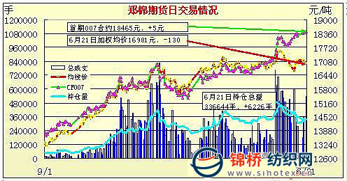 6月21日,鄭棉CF1009合約高開,早盤上沖后在空頭賣盤打壓下走低,盤中區(qū)間盤整,午后一度減倉反彈,但是隨后的空頭賣盤打壓期價回落收弱,日線形成1/2下影線的陰線,日內(nèi)成交量放大,持倉量增加。CF1101合約高開下探,盤中在低位空頭回補(bǔ)的支撐下止跌,午后減倉反抽,隨后多頭平倉盤打壓期價回落震蕩,日線形成陰線星,日內(nèi)成交量放大,持倉量小幅增加。CF1009合約日成交148334手,日增倉3978手,終盤持倉量111128手;CF1101合約日成交365228手,日增倉2716手,終盤持倉量168302手?;久媲闆r:棉價過高,市場風(fēng)險不斷加大,紡織企業(yè)采購皮棉趨緩,只有急需用棉的企業(yè)少量采購,整體觀望氣氛較濃。當(dāng)前出貨以部分囤棉較少的棉企為主,三級提貨報價18200元/噸,略有成交。