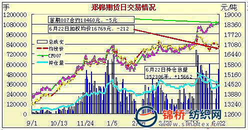 6月22日,鄭棉CF1009合約小幅低開,早盤反復(fù)震蕩,午后空頭賣盤打壓期價下試,尾盤在回補(bǔ)買盤支撐下收強(qiáng),日線形成小陽線,日內(nèi)成交量萎縮,持倉量增加。CF1101合約低開增倉盤整,午后空頭賣盤打壓期價下滑,此后低位在多頭買盤支撐下止跌盤整,尾盤在短線回補(bǔ)盤支撐下回升,日線形成1/2下影線的陰線,日內(nèi)成交量萎縮,持倉量大幅增加。CF1009合約日成交74528手,日減倉1930手,終盤持倉量109198手;CF1101合約日成交318012手,日增倉16758手,終盤持倉量185060手?;久媲闆r:近日傳言拋儲和增發(fā)放配額越演越烈,紡企聞聲多是觀望。傳言雖然仍未落實(shí),但市場信心普遍受到影響,購銷雙方均意識到后市風(fēng)險較大,棉企清貨積極,紡企采購謹(jǐn)慎?,F(xiàn)貨棉商報價仍居高,部分新疆棉二級報價18700-19000元/噸,內(nèi)地三級棉凈重報價18300元/噸,印度棉三級報價與國內(nèi)棉價相當(dāng),也在18300元/噸左右。市場總體觀望氣氛濃厚,成交稀少,紡企等待調(diào)控政策出臺。