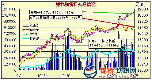 6月28日,鄭棉CF1009合約早盤下探后在多頭買盤推動(dòng)下脫離低點(diǎn)盤升,終盤在空頭回補(bǔ)支撐下收強(qiáng),日線形成2/3下影線的小陰線,日內(nèi)成交量萎縮,持倉量減少。鄭棉CF1101合約高開,早盤下試后低位增倉放量,隨后在多頭買盤推動(dòng)下上沖,午后重心上移盤整,日線形成長(zhǎng)下影線的陽線星,日內(nèi)成交量萎縮,持倉量增加。CF1009合約日成交22200手,日減倉1432手,終盤持倉量101436手;CF1101合約日成交183498手,日增倉4140手,終盤持倉量192804手?;久媲闆r:據(jù)中國(guó)棉花協(xié)會(huì)發(fā)文透露,國(guó)家有關(guān)部門近期將繼續(xù)增發(fā)一部分滑準(zhǔn)稅進(jìn)口配額,以及拋儲(chǔ)60萬噸的預(yù)案也獲批準(zhǔn),交易規(guī)則也已經(jīng)完成,隨時(shí)都有可能啟動(dòng)。此消息出臺(tái),讓紡織企業(yè)有了“定心丸”,并且六七八三個(gè)月是棉紗市場(chǎng)的淡季,紡紗廠補(bǔ)庫不太積極,只等待拋儲(chǔ)及配額發(fā)放,市場(chǎng)成交更加冷清。棉商銷售價(jià)格略有松動(dòng),少量成交以新疆棉為主。外棉銷售有所提價(jià),好三級(jí)凈重提貨報(bào)價(jià)在18400元/噸左右。 CF009合約當(dāng)日交易走勢(shì) |
