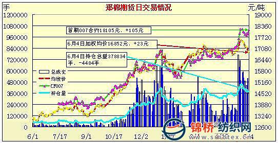 6月4日,鄭棉全線小幅低開,CF1009合約慣性下探后在多頭低位買盤支撐下止跌回升,盤中波段上行,午后空頭回補買盤支撐期價高位盤整,日線形陽線,日內(nèi)成交量萎縮,持倉量下降。CF1101合約低開下行,盤中在空頭逢低回補支撐下走高,日線形成長下影線的陽線,日內(nèi)成交量萎縮,持倉量下滑。CF1009合約日成交104804手,日減倉1178手,終盤持倉量138948手;CF1101合約日成交190788手,日減倉3080手,終盤持倉量182150手?;久媲闆r:現(xiàn)貨報價續(xù)漲,但市場成交仍顯一般。棉商報價過高,紡企預知高價采購風險較大,大部分仍以觀望為主,關注國家政策調(diào)控。國內(nèi)三級現(xiàn)貨成交價維持在17800-18000元/噸左右,紡企主要以采購進口棉為主。棉花種植全國大部分地區(qū)基本結束,湖南、湖北進入掃尾階段,棉苗整體生長良好,種植面積出現(xiàn)北方地區(qū)穩(wěn)定南方地區(qū)增加趨勢。