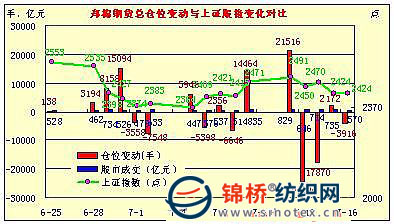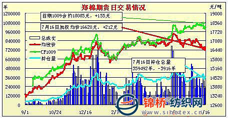7月16日,鄭棉CF1009合約高開,盤中在多頭買盤的推動(dòng)下走高,日線形成高開陽(yáng)線,日內(nèi)成交量與持倉(cāng)量同步增加。鄭棉CF1101合約高開盤整,隨后在空頭回補(bǔ)的支撐下波段走高,尾盤空頭集中回補(bǔ)買盤推動(dòng)期價(jià)收高,日線形成陽(yáng)線,日內(nèi)成交量變化不大,持倉(cāng)量大幅減少。CF1009合約日成交46518手,日增倉(cāng)6218手,終盤持倉(cāng)量100446手;CF1101合約日成交1163854手,日減倉(cāng)10134手,終盤持倉(cāng)量184760手。基本面情況:今日股指與昨日基本持平,但成交量大幅萎縮,上證成交569.87億元,下降22.4%;深證成交490.07億元,下降11.2%。而今日鄭棉期貨成交22.6萬手,較昨日增加10%?,F(xiàn)貨價(jià)格連續(xù)小幅下滑,棉商銷售積極。新疆棉大量到內(nèi)地,但因下游紗錢銷售價(jià)格大幅下滑,紡企對(duì)棉價(jià)看跌情緒較濃,多是停止采購(gòu)維持觀望,等待拋儲(chǔ)。