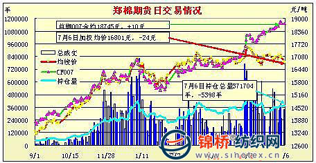 7月6日,鄭棉CF1009合約早盤在多頭買盤推動下沖高,隨后平倉盤打壓期價調整,此后橫向盤整,日線形成小陽線,日內成交量萎縮,持倉量小幅增加。鄭棉CF1101合約低開,早盤在多頭買盤支撐下回升盤整,隨后空頭回補推動期價沖擊日高,盤中橫向窄幅整理,日線形成低開陽線,日內成交量萎縮,持倉量減少。CF1009合約日成交296306手,日減倉536手,終盤持倉量108398手;CF1101合約日成交183036手,日減倉6062手,終盤持倉量189966手。基本面情況:今日股市增量反彈,上證指數(shù)2409.42點,漲幅1.9%;深證指數(shù)9363.02點,漲幅2.1%。成交金額分別為576.29億元和523.26億元,分別增加128.82億元和118.51億元,漲幅分別達28.6%和29.3%。鄭棉期貨今日則減持倉5398手,減幅1.4%?,F(xiàn)貨成交愈發(fā)冷清,成交價格維持平穩(wěn)。高等級棉難尋,紡織廠期待拋儲,當前采購尤為消極。囤棉企業(yè)擔心拋儲后棉價下滑,出售積極,預計成交冷清局面將延續(xù)到拋儲出臺。另據(jù)紡企反饋,棉紗價格依然堅挺,但市場已經不如前一段時間活躍,出現(xiàn)挑貨現(xiàn)象。