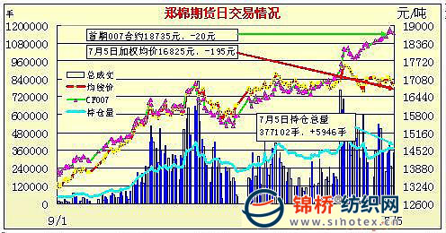 7月5日,鄭棉CF1009合約小幅低開,早盤反復(fù)震蕩,午間在平倉盤打壓下增量下試,午后因空頭回補止跌回升,日線形成小陰線,日內(nèi)成交量變化不大,持倉量大幅減少。鄭棉CF1101合約低開,早盤在空頭賣盤打壓下走低,盤中受到空頭回補與多頭買盤承接作用下低位盤整,日線形成陰線,日內(nèi)成交量放大,持倉量增加。CF1009合約日成交48306手,日減倉7308手,終盤持倉量107862手;CF1101合約日成交271436手,日增倉12930手,終盤持倉量196028手?;久媲闆r:囤棉企業(yè)報價混亂,并且較高,紡企多意識風(fēng)險較大,難以成交。部分大型紡織企業(yè)已經(jīng)接到第三批配額發(fā)放消息,近日有望拿到。部分紡企庫存能用到8月份,等待國家拋儲來補充9月庫存。另據(jù)紡企反饋,下游企業(yè)壓力加重,棉紗價格有下降趨勢。