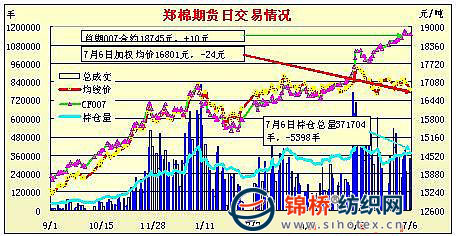 7月7日,鄭棉CF1009合約低開,盤中下探后在多頭買盤支撐下回升盤整,日線形成星線,日內(nèi)成交量萎縮,持倉量小幅增加。鄭棉CF1101合約低開,盤中橫向窄幅整理,尾盤在空頭回補(bǔ)支撐下回升,日線形成低開陰線星,日內(nèi)成交量萎縮,持倉量增加。CF1009合約日成交26738手,日減倉454手,終盤持倉量108852手;CF1101合約日成交171264手,日增倉1978手,終盤持倉量191944手?;久媲闆r:現(xiàn)貨市場較為平淡,囤棉棉商較少,報(bào)價(jià)者越來越少,價(jià)格與前幾日基本持平,仍有個(gè)別囤棉企業(yè)惜售,打算存到8月份再清空。大部分紡企繼續(xù)關(guān)注國家拋儲(chǔ),基本沒有采購,市場購銷極為冷清。