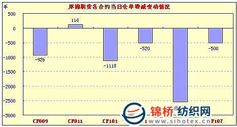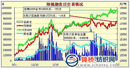 8月17日,鄭棉平倉打壓,震蕩下調(diào),成交萎縮,繼續(xù)減倉。今日總成交1.76萬手,減少3.77萬手,成交金額67.04億元,連續(xù)兩個交易日成交金額百億元以下,比昨日再減32.65億元,減幅32.8%。持倉量繼續(xù)下挫,總持倉28.54萬手,減倉5498手。成交主體價17270元,8連漲的鄭棉今日中幅回落。當(dāng)日CF1101合約小幅低開,午前在多頭平倉與空頭賣盤的打壓下探低,午后多頭買盤支撐期價增倉回穩(wěn),尾盤減倉調(diào)整,日線陰線星,日內(nèi)成交量萎縮,持倉量下降。CF1101合約日成交45414手,日減倉1118手,終盤持倉量149266手;CF1105合約日成交27118手,日減倉2548手,終盤持倉量88632手?;久媲闆r:現(xiàn)貨價格處于平穩(wěn)。儲備棉競拍價格較前期也有所走穩(wěn),加價積極性降低?,F(xiàn)貨市場棉花基本無人問津,即使降價銷售也仍是不能成交。新疆棉也較前期難銷,紡織廠一心關(guān)注儲備棉。部分中小紡企資金較為緊張,維持觀望。