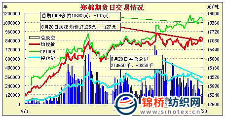 8月20日,受隔夜美國經(jīng)濟(jì)數(shù)據(jù)令市場疑慮驟增和昨日拋儲(chǔ)棉流拍下挫等影響,鄭棉低開下滑,全線收跌。今日鄭棉CF1101合約小幅低開,早盤在多頭買盤推動(dòng)下沖高,隨后空頭賣盤打壓期價(jià)迅速回落并擊穿萬七關(guān)口,此后橫向盤整,尾盤在平倉盤壓制下收低,日線形成長陰線,日內(nèi)成交量放大,持倉量增加。CF1101合約日成交172942手,日增倉7916手,終盤持倉量155948手;CF1105合約日成交69010手,日減倉9372手,終盤持倉量78826手。 基本面情況:現(xiàn)貨價(jià)格繼續(xù)下滑,棉商對(duì)后市失去信心,積極甩貨。據(jù)紡企反饋,日前三級(jí)以下棉價(jià)跌幅較大,紡織企業(yè)無人問津。紡企對(duì)儲(chǔ)備棉競拍關(guān)注度降低,多是適量采購。