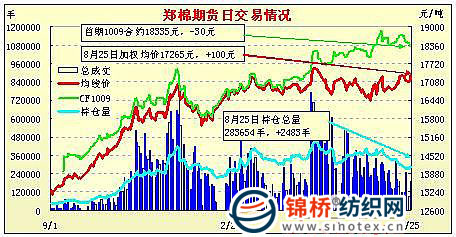 8月25日,鄭棉CF1101合約高開,早盤調(diào)整后在多頭買盤推動下上行盤整,午后受到平倉盤壓制回落,日線形成高開陰線,日內(nèi)成交量變化不大,持倉少量增加。CF1101合約日成交131502手,日增倉3026手,終盤持倉量131502手;CF1105合約日成交56972手,日增倉966手,終盤持倉量85518手?;久媲闆r:近兩日,我國大部分產(chǎn)棉區(qū)出現(xiàn)不同程度降雨,對籽棉吐絮產(chǎn)生一定影響。湖北、安徽、新疆等地已有籽棉零星采摘,部分加工廠開秤收購,交售量極少,但從日前湖北部分加工廠收購的籽棉來看,質(zhì)量尚可,基本能達(dá)到四級以上。新年集中上市逐漸臨近,棉商出貨積極,價格有繼續(xù)下滑趨勢。