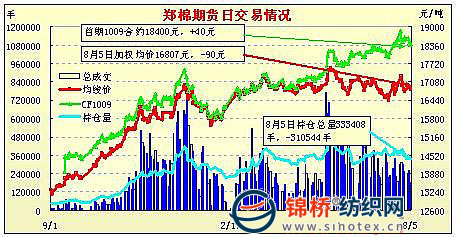 8月5日,鄭棉CF1101合約平開,早盤反彈后在多頭平倉盤打壓下回落,日線形成陰線,日內(nèi)成交量萎縮,持倉量下滑。CF1009合約日成交6858手,日減倉3080手,終盤持倉量28860手;CF1101合約日成交109880手,日減倉8820手,終盤持倉量186266手。基本面情況:現(xiàn)貨賣的多買的少,棉商和紡企都在賣新疆棉,浙江某棉商新疆棉銷售價下調(diào)到18300元/噸,但仍不好賣,大部分紡廠庫存較充裕,并且都看好拋儲價格,認(rèn)為棉價在18000元/噸左右才能接受。