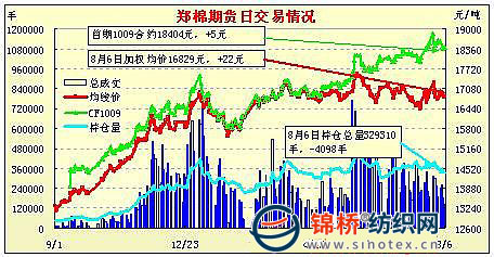 8月6日,鄭棉CF1101合約高開,早盤沖高上試,隨后多頭平倉盤打壓期價調(diào)整,午后空頭回補(bǔ)推動期價回升,日線形成陽線星,日內(nèi)成交量萎縮,持倉量小幅下滑。CF1009合約日成交3220手,日減倉2588手,終盤持倉量26272手;CF1101合約日成交105352手,日減倉1636手,終盤持倉量184630手?;久媲闆r:市場反饋,目前棉花現(xiàn)貨銷售十分困難,并非是紡織廠不用棉花了,主要是拋儲在即紡織企業(yè)不慌不忙,認(rèn)為棉花價格將向下運(yùn)行。當(dāng)前紡織企業(yè)庫存原料懸殊,小紡廠庫存15天,大紡廠一般在2-3個月甚至有企業(yè)可維持到年底。坊間傳言拋儲起拍價為16500元,但是據(jù)傳一旦有越拍越高超過市場價格的情況出現(xiàn),政府將臨時出臺封頂價預(yù)案,從種種跡象看,政策面態(tài)度是相對認(rèn)可當(dāng)前市場價格的,既不支持過高的價格損害紡織企業(yè)利益,也不支持過低的價格損傷棉農(nóng)利益。