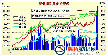 9月13日,鄭棉主要合約平開,早盤在多頭買盤推動下上沖,隨后受到空頭賣盤打壓下滑,此后低位盤整,午后重心略有上移,尾盤在平倉盤打壓下小幅回落,日線形成長下影線的陰線星,日內(nèi)CF1101合約成交量與前一日基本持平,CF1105合約成交量放大,遠(yuǎn)期合約持倉量繼續(xù)大幅增加。CF1101合約日成交162960手,日增倉4062手,終盤持倉量119902手;CF1105合約日成交1007984手,日增倉26310手,終盤持倉量318820手?;久媲闆r:現(xiàn)貨穩(wěn)中小漲,成交依然較為清淡。各地主產(chǎn)棉區(qū)陸續(xù)開始采摘,棉農(nóng)惜售,加工廠上調(diào)籽棉收購價格,收購等級多為四級。未開秤企業(yè)多認(rèn)為收購風(fēng)險較大,保持繼續(xù)觀望。大部分加工廠收購價格在4元/斤左右,安徽個別廠家收購價格報到4.2-4.3元/斤,主要為了吸引棉農(nóng)交售。