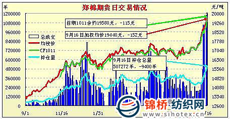 9月16日,紐期沖高回落,鄭棉主要合約低開,早盤在空頭賣盤與短線平倉盤打壓下回落,盤中低位整理,午后在多頭買盤與空頭回補(bǔ)的推動(dòng)下回升,日線形成星線,日內(nèi)成交量萎縮,持倉量減少。CF1101合約日成交238912手,日減倉4904手,終盤持倉量151920手;CF1105合約日成交797940手,日減倉5046手,終盤持倉量330918手?;久媲闆r:市場報(bào)價(jià)混亂,成交一般。籽棉上市量逐漸增多,但多是棉農(nóng)隨摘隨賣,水分較高,大部分在15%-18%。加工廠為收購更多資源,報(bào)價(jià)不斷上調(diào),尤其山東部分加工廠到湖北、安徽等地跨省收購,送到廠最高收購價(jià)到4.5元/斤。湖北地區(qū)收購等級(jí)三級(jí)較多,其它地區(qū)收購等級(jí)以四級(jí)為主,收購價(jià)普遍在3.9-4.1元/斤。