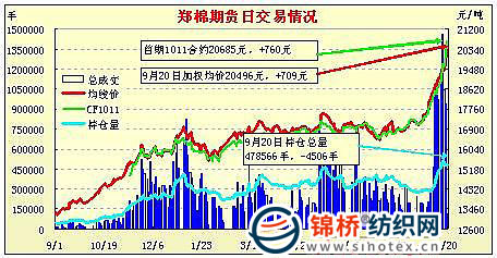 9月20日,上周五紐期繼續(xù)上漲突破長(zhǎng)線壓力位,影響今日鄭棉主要合約大幅高開(kāi),主要合約早盤(pán)調(diào)整后在空頭止損盤(pán)的帶動(dòng)下封于漲停,日線形成高開(kāi)小陽(yáng)線,日內(nèi)成交量萎縮,持倉(cāng)量略有減少。CF1101合約日成交22166手,日減倉(cāng)1910手,終盤(pán)持倉(cāng)量131450手;CF1105合約日成交85298手,日減倉(cāng)1020手,終盤(pán)持倉(cāng)量323224手?;久媲闆r:隨著部分產(chǎn)棉區(qū)天氣轉(zhuǎn)晴,棉農(nóng)采摘量增加,部分400型廠陸續(xù)開(kāi)秤參與收購(gòu)。湖北地區(qū)棉企籽棉收購(gòu)量及收購(gòu)品級(jí)均有所提高,棉企不斷提價(jià)。湖北、安徽、河北、陜西等地略好籽棉收購(gòu)價(jià)達(dá)到4.2-4.5元/斤左右,水分仍在15-17%。