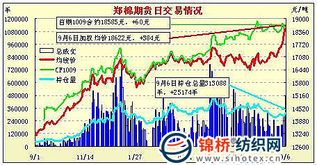 9月6日,鄭棉主要合約平開,CF1101合約在多頭買盤支撐下上行,盤中換手盤整,CF1105合約受到多頭持續(xù)買盤推動上行,午后主要合約繼續(xù)上行,尾盤在平倉盤壓制下小幅回落,日線形成長陽線,日內(nèi)成交量放大,遠期合約持倉量大幅增加。CF1101合約日成交159740手,日增倉2234手,終盤持倉量119854手;CF1105合約日成交301072手,日增倉23974手,終盤持倉量171622手。基本面情況:現(xiàn)貨價格穩(wěn)中略有上調,湖北地區(qū)已有棉企開始零星加工,部分周邊紡企訂購,交貨價好四弱三級新棉到廠17500元/噸左右,預計下周能用上。日前收購居多的仍以湖北為主,安徽有零星開秤,收購價均在3.7-4.1元/斤,部分加工廠衣分較高,質量較好的收到4.2元/斤,棉農(nóng)交售依然很少。