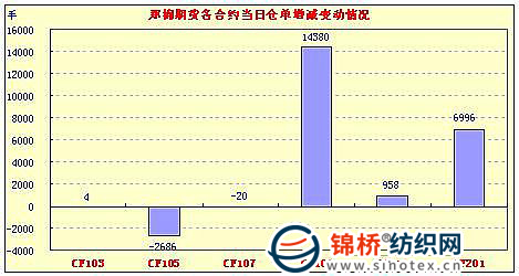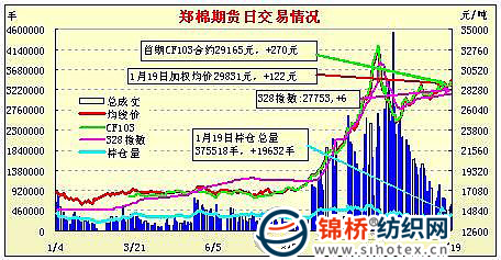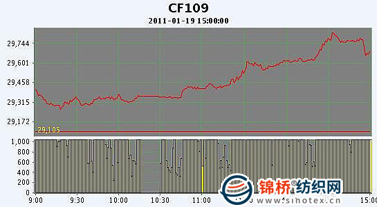 1月19日,鄭棉CF1109合約高開,早盤反復震蕩低位增倉,隨后增倉上揚,午后創(chuàng)日高,尾盤在多頭集中平倉打壓下回落,日線形成高開小陽線,日內(nèi)成交量變化不大,持倉量增加。CF1105合約日成交14604手,日減倉2686手,終盤持倉量36856手;CF1109合約日成交491944手,日增倉14380手,終盤持倉量249152手?;久媲闆r:紡織廠春節(jié)前補庫基本進入尾聲,不少企業(yè)已經(jīng)完成采購,也有一些企業(yè)將采購中心移至進口棉市場,在對春節(jié)后市場看漲的強烈預期下,近期棉市下跌不足上漲有余?,F(xiàn)貨價格企穩(wěn)各地籽棉收購價格也小幅上漲,棉農(nóng)惜售現(xiàn)象有所改觀,企業(yè)的日收購量有所增加,但是仍有小部分棉農(nóng)存棉待春節(jié)后再賣。