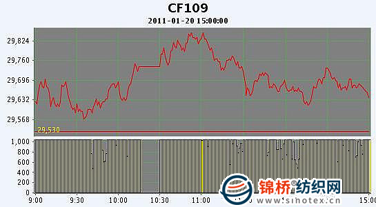 1月20日,鄭棉CF1109合約低開,早盤反復(fù)震蕩后在多頭買盤推動下沖高,午后受平倉盤打壓下滑,日線形成小陽線,日內(nèi)成交量變化不大,持倉量先增后減。CF1105合約日成交8330手,日減倉552手,終盤持倉量36304手;CF1109合約日成交474962手,日減倉1358手,終盤持倉量247794手。基本面情況:隨著農(nóng)歷新年的臨近,前期市場補(bǔ)庫需求也漸漸結(jié)束,不少企業(yè)開始或已經(jīng)放假,市場的供銷氛圍趨于平淡;但是受近日電子盤以及下游紗線價格支撐,棉企報價上調(diào)同時繼續(xù)看好后市;今日現(xiàn)貨報價、成交穩(wěn)定,與前一日相比變化不大。受到近期棉價上漲提振,前期收購量偏低的山東棉區(qū)近期收購量略有增加,當(dāng)?shù)孛揶r(nóng)售棉意愿有所增加,企業(yè)日收購量擴(kuò)大,但是由于質(zhì)量下降且混等混級,多數(shù)企業(yè)已經(jīng)停收放假,只有少數(shù)企業(yè)在收購。