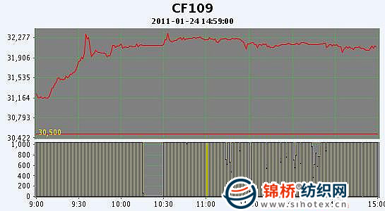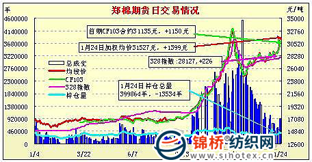 1月24日,鄭棉CF1109合約高開,早盤在多頭買盤與空頭止損的帶動下迅速沖高,隨后在短線平倉盤的壓制下調(diào)整,午后盤整震蕩,日線形成高開長陽線,日內(nèi)成交量變化不大,持倉量下降。CF1109合約日成交778890手,日減倉17242手,終盤持倉量256346手;CF1111合約日成交73692手,日減倉5662手,終盤持倉量59268手?;久媲闆r:棉紗市場似乎有些復蘇回暖,紡織廠看好春節(jié)后市場,這給市場帶來了一定的支撐。但是一些中小型紡織廠目前更關心的還是資金問題,而近期國內(nèi)棉花價格呈現(xiàn)小幅上漲的態(tài)勢,紡織廠買漲不買跌,帶動近期現(xiàn)貨成交有所回升,但是春節(jié)的臨近,市場將漸漸轉為清淡。采購的紡織廠也反映出了今年棉花的質量欠佳,想買到好棉花很難,這也使得紡織廠在配棉上比較困難,造成了新疆棉的搶手。