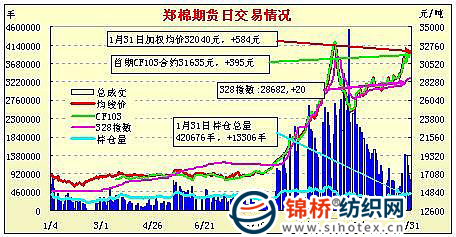 1月31日,鄭棉CF1109合約低開,早盤在多頭買盤推動(dòng)下持續(xù)上沖,盤中高位成交放量,午后在空頭賣盤和多頭平倉的壓制下小幅回落,日線形成陽,日內(nèi)成交量萎縮,持倉量增加。CF1109合約日成交670588手,日增倉9122手,終盤持倉量263054手;CF1111合約日成交59466手,日減倉3270手,終盤持倉量53770手。基本面情況:國內(nèi)棉花現(xiàn)貨價(jià)格基本保持平穩(wěn),市場(chǎng)上購銷活動(dòng)已經(jīng)逐步停止。春節(jié)臨近,各地加工廠逐步停工,庫存籽棉以待來年開機(jī),紡織廠也已經(jīng)基本進(jìn)入節(jié)日假期,原料采購暫停,現(xiàn)貨實(shí)際成交已經(jīng)寥寥無幾,市場(chǎng)再度活躍只得期待兔年伊始。