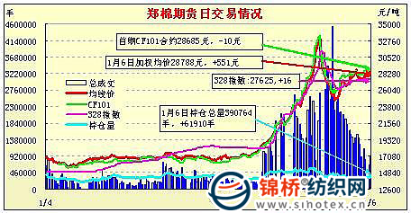 1月6日,鄭棉CF1109合約高開,盤中在多頭買盤推動下增倉上揚,午后高位震蕩,終盤收于日高,日線形成陽線,日內(nèi)成交量放大,持倉量增加。CF1105合約日成交20696手,日增倉1756手,終盤持倉量51942手;CF1109合約日成交825814手,日增倉56286手,終盤持倉量278712手。基本面情況:國內(nèi)棉花現(xiàn)貨價格穩(wěn)中上漲,市場成交依舊清淡,紡織廠價格低,軋花廠不肯送,看好后市出貨意愿并不強烈。昨日,山東地區(qū)一大型棉紡企業(yè)正式公布了皮棉收購價格,其中公定3級為27600元,4級為27300元,不過據(jù)信息員反饋廠家有壓價收購的趨勢。