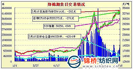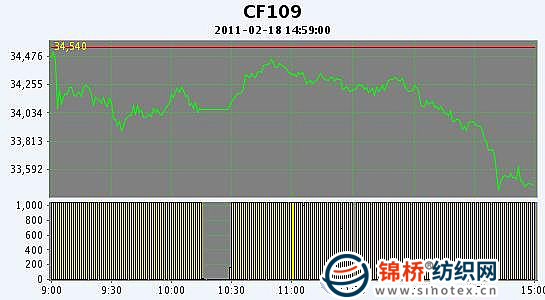 2月18日,鄭棉CF1109合約高開,早盤在空頭賣盤打壓下回落,午前一度增倉回升,午后受到多頭平倉與空頭賣盤打壓收低,日線形成高開陰線,日內(nèi)成交量溫和放大,持倉少量增加。CF1109合約日成交1183804手,日增倉1262手,終盤持倉量291316手;CF1111合約日成交35124手,日減倉3112手,終盤持倉量49698手。基本面情況:國內(nèi)現(xiàn)貨價格繼續(xù)上漲,但成交有價無市,一方面棉商大多不愿出售,即使想要出售報價也較高,另一方面紡織廠在猶豫到底要不要采購棉花。受到棉花價格上漲影響,棉紗銷售放量上漲,尤其是32S和40S需求較大。