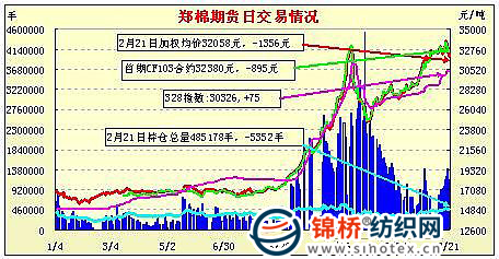 2月21日,鄭棉CF1109合約低開(kāi),早盤恐慌止損盤的打壓下走低,隨后多頭承接買盤支撐期價(jià)反彈整理,午后空頭繼續(xù)打壓期價(jià)跳水下行,尾盤在空頭集中回補(bǔ)的支撐下反抽,日線形成低開(kāi)陰線,日內(nèi)成交量較前一日略減,持倉(cāng)少量先增后減。CF1109合約日成交983576手,日減倉(cāng)6774手,終盤持倉(cāng)量284542手;CF1111合約日成交34988手,日增倉(cāng)1834手,終盤持倉(cāng)量51532手?;久媲闆r: 國(guó)內(nèi)現(xiàn)貨市場(chǎng)報(bào)價(jià)跟漲依舊,但是成交暫不活躍。隨著正月十五已經(jīng)結(jié)束,節(jié)日氣氛消退,籽棉收購(gòu)略顯活躍,多數(shù)企業(yè)都在為十五之后開(kāi)工做準(zhǔn)備,市場(chǎng)看漲氣氛較濃厚。