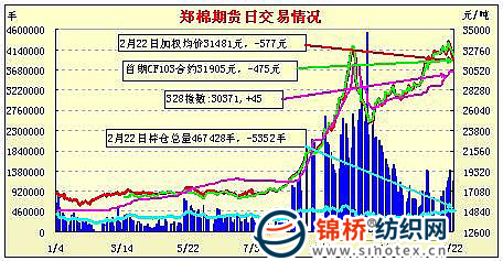 2月22日,鄭棉CF1109合約平開,早盤在多頭買盤推動(dòng)下沖高,盤中高位換手后受到空頭打壓迅速跳水,午間創(chuàng)日低,午后在多頭買盤與空頭短線回補(bǔ)盤支撐下反彈,日線形成陰線星,日內(nèi)成交量放大,持倉(cāng)少量先增后減。CF1109合約日成交1544218手,日減倉(cāng)7274手,終盤持倉(cāng)量277268手;CF1111合約日成交58976手,日減倉(cāng)4340手,終盤持倉(cāng)量47192手?;久媲闆r:現(xiàn)貨商大多還在看多所以銷售意愿不是很強(qiáng),大部分大中型紡織廠還在消耗春節(jié)前采購(gòu)庫(kù)存,所以進(jìn)貨量不大。正月十五過后,在冀魯豫三省軋花廠幾乎全面開機(jī),但是收購(gòu)量仍是不大,仍有多部分棉花留滯在棉農(nóng)或棉販?zhǔn)种小?/p>