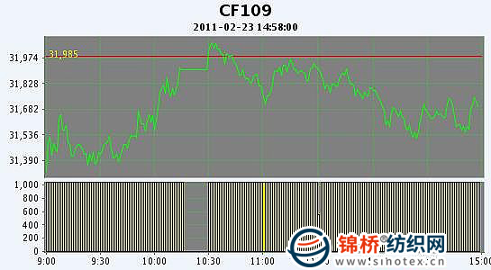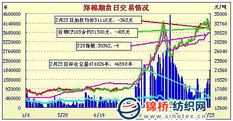 2月23日,鄭棉CF1109合約低開,早盤寬幅震蕩后在多頭買盤推動(dòng)下沖高,盤中高位成交量放大,午后受到空頭打壓回落,尾盤在空頭短線回補(bǔ)盤支撐下反彈,日線形成低開陽(yáng)線,日內(nèi)成交量萎縮,持倉(cāng)少量增加。CF1109合約日成交1323868手,日增倉(cāng)8068手,終盤持倉(cāng)量285336手;CF1111合約日成交45886手,日減倉(cāng)1438手,終盤持倉(cāng)量45754手?;久媲闆r:現(xiàn)貨銷售略有松動(dòng),市場(chǎng)觀望情緒增多,紗線價(jià)格節(jié)節(jié)攀高但實(shí)質(zhì)有價(jià)無(wú)市,由于節(jié)前部分紡織廠以及經(jīng)銷商手中囤積了一些低價(jià)棉紗,在當(dāng)前這個(gè)高價(jià)位上,成交情況不是十分紅火,有價(jià)無(wú)市的情況確實(shí)存在。