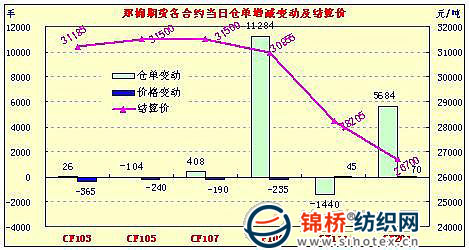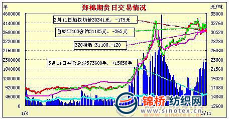 3月11日,鄭棉CF1109合約低開,早盤在多頭推動下沖高,盤中高位震蕩后在空頭賣盤與多頭平倉的壓力下迅速下滑,午后創(chuàng)日低,隨后受空頭短線回補與多頭承接買盤的支撐下脫離低點盤整,日線形成低開陰線星,日內(nèi)成交量變化不大,持倉量增加。CF1109合約日成交1728816手,日增倉11284手,終盤持倉量3866040手;CF1111合約日成交14166手,日減倉1440手,終盤持倉量39414手。基本面情況:現(xiàn)貨報價有所松動,企業(yè)出貨心理增強,但是紡織廠純棉紗方面銷售不暢,難有資金采購棉花,只能隨買隨用,觀望氣氛比較濃厚。棉商和軋花廠方面,手中存貨量較大的企業(yè)近兩日出貨意愿明顯增強,而手中存貨較少的企業(yè)仍然報價堅挺。目前正值兩會期間,國家對于農(nóng)產(chǎn)品價格方面的調(diào)控值得關(guān)注,同時對于資金流動行問題也是市場關(guān)注的焦點。
