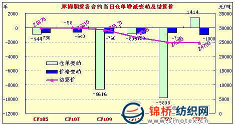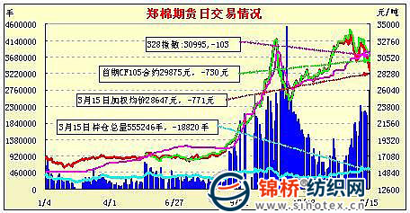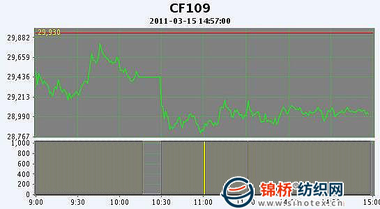 3月15日,鄭棉CF1109合約平開(kāi),早盤調(diào)整后反抽沖高,盤中高位換手后大幅跳水,午后窄幅震蕩,交投重心下移,日線形成陰線,日內(nèi)成交量變化不大,持倉(cāng)量小幅下滑。CF1109合約日成交2315796手,日減倉(cāng)8616手,終盤持倉(cāng)量380478手;CF1111合約日成交16894手,日減倉(cāng)808手,終盤持倉(cāng)量36836手?;久媲闆r:棉花現(xiàn)貨報(bào)價(jià)繼續(xù)下調(diào),周末山東魏橋紡織下調(diào)4級(jí)棉采購(gòu)價(jià)100元。日本遭受強(qiáng)烈地震海嘯,短期內(nèi)將對(duì)大宗商品價(jià)格利空,今日國(guó)內(nèi)兩個(gè)電子盤大幅下探,鄭棉主力合約cf1109開(kāi)盤30950元/噸,午盤收?qǐng)?bào)29690元,跌破三萬(wàn)?,F(xiàn)貨市場(chǎng)擔(dān)憂情緒開(kāi)始蔓延,軋花廠和棉商出貨進(jìn)一步加快,落袋為安心理增強(qiáng)。棉紗價(jià)格繼續(xù)下跌,紡織廠情緒不佳采購(gòu)力度減弱。