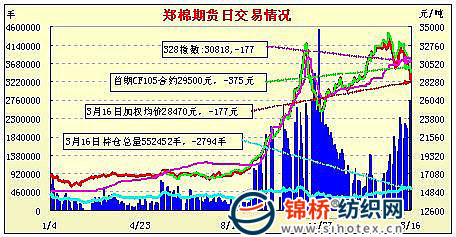 3月16日,鄭棉CF1109合約小幅低開,早盤調(diào)整后在多頭買盤支撐下回升,午間一度在多頭平倉(cāng)盤的壓力下創(chuàng)日低,午后在多頭買盤與空頭回補(bǔ)的推動(dòng)下大幅回升沖高,終盤收于日高點(diǎn),日線形成陽(yáng)線,日內(nèi)成交量變化不大,持倉(cāng)量小幅增加。CF1109合約日成交2142620手,日增倉(cāng)5654手,終盤持倉(cāng)量386132手;CF1111合約日成交14874手,日減倉(cāng)268手,終盤持倉(cāng)量36568手。基本面情況:各地現(xiàn)貨報(bào)價(jià)普遍開始下調(diào),但紡織廠依舊不愿采購(gòu),所以現(xiàn)貨成交極為冷清,另?yè)?jù)駐地信息員反饋山東魏橋紡織下調(diào)了其3級(jí)皮棉采購(gòu)價(jià)500元至29500元/噸;之前現(xiàn)貨上報(bào)價(jià)堅(jiān)挺的新疆棉今日?qǐng)?bào)價(jià)也開始下滑。電子盤暫時(shí)跌破三萬(wàn)的神壇,市場(chǎng)銷售心理出現(xiàn)恐慌,希望落袋為安的企業(yè)增多。從河北、山東等地了解,仍有大部分籽棉存于農(nóng)戶手中,近兩日籽棉收購(gòu)價(jià)格下調(diào),交售量略有增加。