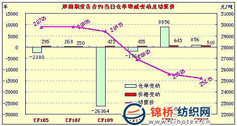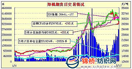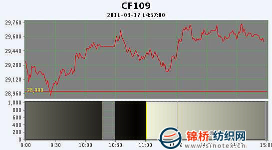 3月17日,鄭棉CF1109合約小幅低開,早盤調(diào)整后在空頭回補(bǔ)支撐下回升,午前一度在多頭平倉的壓力下調(diào)整,午后多頭買盤再度推動期價回升震蕩,尾盤在平倉盤的壓制下回落,日線形成低開陽線,日內(nèi)成交量放大,持倉量大幅減少。CF1109合約日成交2249608手,日減倉26364手,終盤持倉量359768手;CF1111合約日成交13420手,日減倉1762手,終盤持倉量34806手?;久媲闆r:昨日山東魏橋紡織再次下調(diào)其皮棉采購價500元/噸,三級棉采購價格至29000元/噸;加上電子撮合和鄭棉期貨開盤后繼續(xù)大幅走低,市場信息受挫,皮面現(xiàn)貨報價開始下調(diào),低等級棉價格下調(diào)幅度較大;一些庫存較大的廠出現(xiàn)了恐慌性銷售。紡織廠向來買漲不買跌,加上庫存積壓、資金緊張等因素,采購一直不給力,因此現(xiàn)貨市場上成交依舊不旺。另反饋,由于近兩日現(xiàn)貨和電子盤波動較大,黃河流域部分軋花廠暫停收購加工籽棉。