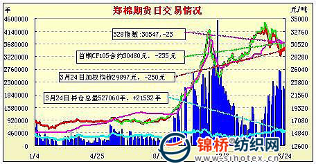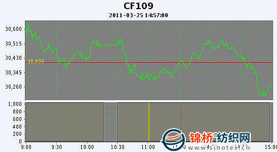 3月25日,鄭棉CF1109合約小幅高開,早盤在空頭打壓下下行,盤中受到短線多頭支撐反抽后再度下落,午間創(chuàng)日低,午后一度反彈,但是尾盤受到多頭集中平倉的壓制迅速跳水,日線形成高開小陰線,日內(nèi)成交量變化不大,持倉量減少。CF1109合約日成交1453562手,日減倉14920手,終盤持倉量357976手;CF1111合約日成交8476手,日減倉1674手,終盤持倉量32738手?;久媲闆r:棉花銷售不暢,下游市場遲遲打不開,對上游銷售壓力越積越大。近期外棉市場比國內(nèi)市場熱鬧的多,大棉商回購棉花,在高價(jià)轉(zhuǎn)銷到東南亞的其他國家。企業(yè)心態(tài)很糾結(jié),一些“頑固派”的貿(mào)易商堅(jiān)持供需缺口問題繼續(xù)看漲,但是大多數(shù)的貿(mào)易商開始轉(zhuǎn)為“行動(dòng)派”,積極主動(dòng)銷售手中棉花,值得注意的是他們積極銷售的多是手中低等級棉花,對高等級的囤積現(xiàn)象仍然存在。