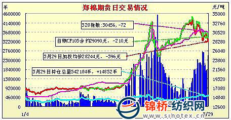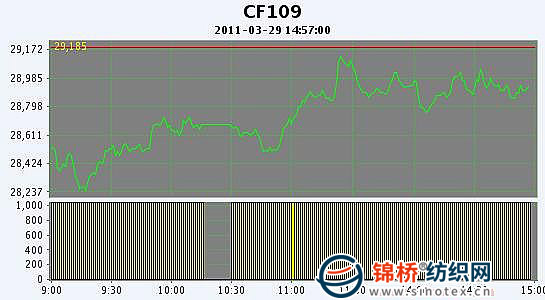 3月29日,鄭棉CF1109合約小幅低開,早盤慣性調(diào)整后在多頭買盤支撐下走高,午間創(chuàng)日高,午后在短線平倉盤的壓力下調(diào)整橫向整理,交投重心較午前明顯上移,日線形成低開陽線,日內(nèi)成交量放大,持倉量增加。CF1109合約日成交2140438手,日增倉12638手,終盤持倉量376860手;CF1111合約日成交8898手,日減倉222手,終盤持倉量30256手。基本面情況:目前春播工作正由南向北陸續(xù)展開,河北地區(qū)植棉意向增加較大,另今年農(nóng)資產(chǎn)品從種子到化肥到農(nóng)藥均普遍上漲10-20%。雖然物化成本增加,但由于對今年籽棉價格信心較大,棉農(nóng)種棉積極性仍然較好。