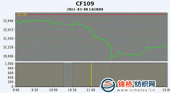 3月8日,鄭棉CF1109合約低開,午前反復(fù)震蕩后下滑,盤中低位大量換手,午間在空頭賣盤打壓下迅速跳水,午后創(chuàng)日低,盤中低位增量換手后反抽,日線形成1/3下影線的陰線,日內(nèi)成交量放大,持倉量微增。CF1109合約日成交1891186手,日增倉5412手,終盤持倉量371912手;CF1111合約日成交30060手,日減倉3024手,終盤持倉量41648手?;久媲闆r:現(xiàn)貨報價穩(wěn)中小幅上揚,市場上成交量依舊不大,下游紗廠庫存壓力較大,采購也不積極,市場上除了新疆棉銷售較好外,地產(chǎn)成交的多是弱4級的棉花。市場上大棉商繼續(xù)囤貨看漲,而小型的棉企銷售積極性則較高,售空存棉兌現(xiàn)保障較為理想的利潤成為不少棉企的首選策略。