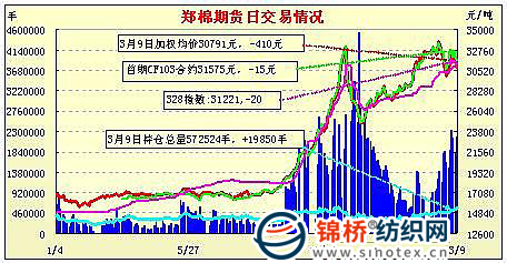 3月9日,鄭棉CF1109合約平開,早盤調(diào)整下行后在多頭買盤推動(dòng)下反彈震蕩,午間放量增倉(cāng)拉高,午后重心上移震蕩,尾盤在多頭集中平倉(cāng)盤壓制下調(diào)整,日線形成陽(yáng)線,日內(nèi)成交量變化不大,持倉(cāng)量增加。CF1109合約日成交1842040手,日增倉(cāng)17448手,終盤持倉(cāng)量389360手;CF1111合約日成交29992手,日增倉(cāng)1270手,終盤持倉(cāng)量42918手?;久媲闆r:現(xiàn)貨上棉商就開始賣棉花,他們手中棉花多是高等級(jí)棉花,目前港口到港的外棉很多,補(bǔ)充了近期市場(chǎng)上的資源。大紡廠采購(gòu)地產(chǎn)棉僅僅是為了配棉,小紡廠買新疆棉花也是為了與滌綸配。兩會(huì)期間不斷有宏觀方面的新聞傳出,對(duì)于后期中國(guó)貨幣政策的闡述,或多或少的給市場(chǎng)帶來利空氣氛。