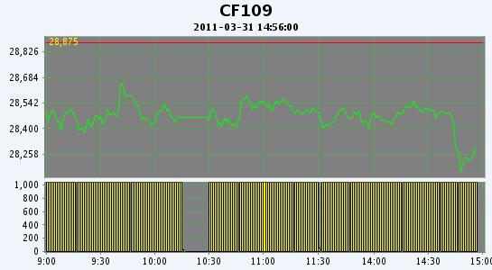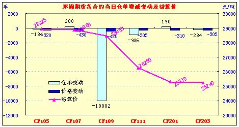 3月31日,鄭棉CF1109合約小幅低開(kāi),盤中橫向?qū)挿鹗?,尾盤在多頭平倉(cāng)打壓下迅速下滑,隨后空頭回補(bǔ)支撐期價(jià)反抽,日線形成低開(kāi)1/2下影線的陰線,日內(nèi)成交量變化不大,持倉(cāng)量先增后減。CF1109合約日成交1910362手,日減倉(cāng)10002手,終盤持倉(cāng)量364608手;CF1111合約日成交7210手,日減倉(cāng)936手,終盤持倉(cāng)量29520手。基本面情況:現(xiàn)貨價(jià)格繼續(xù)下調(diào),成交幾無(wú)。昨日山東魏橋紡織再度下調(diào)其皮棉采購(gòu)價(jià)格500元,329級(jí)降至28500元/噸,429級(jí)降至28000元/噸。 棉商主動(dòng)出擊尋求客戶,有的廠家有的廠家為了達(dá)到盡快出貨的目的,除了降價(jià)之外還實(shí)行全程的送貨上門服務(wù)和分批結(jié)算。