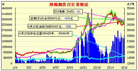 4月13日,鄭棉CF1109合約低開,早盤在多頭賣盤和多頭平倉壓制下走低,午后受空頭回補(bǔ)推動反轉(zhuǎn)走高,日線形成長下影線的陽線,日內(nèi)成交量放大,持倉量大幅減少。CF1109合約日成交1896432手,日減倉29996手,終盤持倉量395856手;CF1111合約日成交293510手,日減倉9046手,終盤持倉量131204手?;久媲闆r:現(xiàn)貨市場繼續(xù)平淡,市場上成交依舊不旺。紡織廠為了去庫存繼續(xù)降價(jià)銷售,但是下游采購仍不是很理想。近期電子盤寬幅震蕩,現(xiàn)貨采購不旺,市場上一部分看供需的人繼續(xù)看多且信心堅(jiān)定,但是紡織廠多擔(dān)心下游消費(fèi)情況,希望下游能盡快回暖,給市場帶來動力。