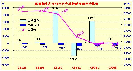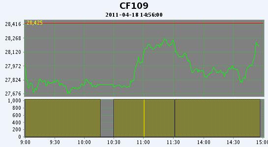 4月18日,鄭棉CF1109合約低開,早盤下探盤整,午間在短線多頭買盤推動下沖高,午后受到平倉盤壓制回落,尾盤在空頭回補(bǔ)支撐下反抽,日線形成1/2下影線的陽線,日內(nèi)成交量保持較高的水平,持倉量小幅增加。CF1109合約日成交1947800手,日增倉9044手,終盤持倉量404086手;CF1201合約日成交335010手,日增倉6242手,終盤持倉量131800手?;久媲闆r:國內(nèi)現(xiàn)貨仍然難以動銷,現(xiàn)貨商開始害怕,積極聯(lián)系下游尋求落袋為安。紡織廠雖然知道自己的庫存在新花上市前是偏緊的,但是在市場陷入利空氣氛的情況下還是觀望為主。據(jù)反饋,湖南常德、岳陽、益陽、長沙等地紡織廠生產(chǎn)情況慘淡,一些大廠為了搶奪訂單,不惜血本降價。
