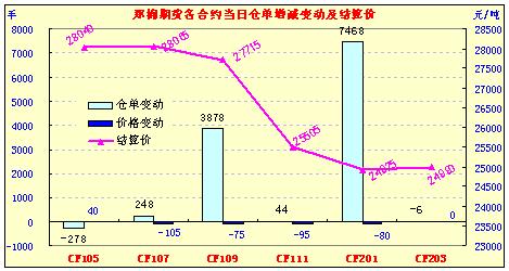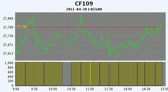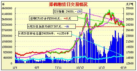 4月20日,鄭棉CF1109合約平開震蕩,午間在多頭買盤推動下沖高,午后震蕩下滑,尾盤受到空頭短線回補支撐回升,日線形成小陽線,日內(nèi)成交量較前一日略減,持倉量小幅增加。CF1109合約日成交1828970手,日增倉3878手,終盤持倉量412982手;CF1201合約日成交240308手,日增倉7468手,終盤持倉量129532手。基本面情況:現(xiàn)貨報價繼續(xù)下調(diào),市場上不乏有一些棉花庫存在千噸以上的棉花企業(yè),他們?yōu)榱吮M快出貨,不惜低價出售。紡織廠下游銷售不動,小型紡織廠關(guān)閉停產(chǎn)的越來越多,大型紡織廠為了接訂單不惜大打折出售庫存。電子盤繼續(xù)下跌,電子撮合和鄭棉9月價格跌至27500元一線,整個市場缺乏動力,利空氣壓繼續(xù)增加。