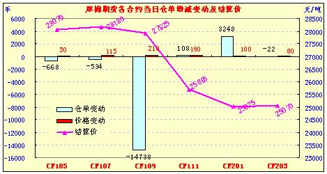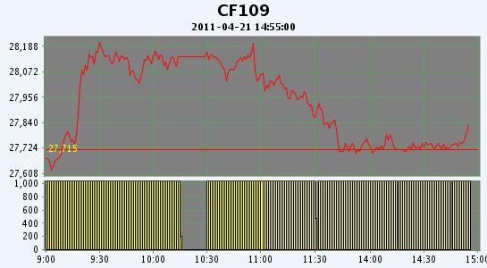 4月21日,鄭棉CF1109合約平開(kāi)上沖,盤(pán)中高位換手增量,隨后在多頭集中平倉(cāng)盤(pán)的打壓下走低,午后重心下移整理,尾盤(pán)受到空頭短線(xiàn)回補(bǔ)支撐回升,日線(xiàn)形成長(zhǎng)上影線(xiàn)的陽(yáng)線(xiàn),日內(nèi)成交量放大,持倉(cāng)量小幅先增后減。CF1109合約日成交2188328手,日減倉(cāng)14738手,終盤(pán)持倉(cāng)量398244手;CF1201合約日成交297502手,日增倉(cāng)3248手,終盤(pán)持倉(cāng)量132780手?;久媲闆r:現(xiàn)貨報(bào)價(jià)繼續(xù)下調(diào),市場(chǎng)對(duì)于后市看法繼續(xù)看低;棉商積極拋售手中存棉,能忍痛割肉,無(wú)奈有價(jià)無(wú)市。即使有紡織廠有原材料庫(kù)存的壓力,但現(xiàn)貨市場(chǎng)上利空氣氛籠罩,企業(yè)采購(gòu)慎之又慎;而棉花庫(kù)存充足的紡織廠受原材料和成品庫(kù)存的雙重積壓,甚至開(kāi)始賣(mài)棉花。