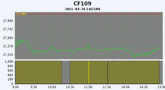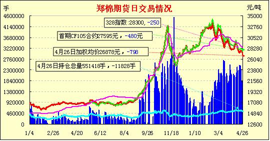 4月26日,鄭棉CF1109合約低開,早盤在空頭賣盤打壓下走低,此后低位盤整,日線形成低開陰線,日內(nèi)成交量萎縮,持倉量減少。CF1109合約日成交1493342手,日減倉15994手,終盤持倉量372764手;CF1201合約日成交260124手,日增倉3660手,終盤持倉量131676手。基本面情況:昨日山東魏橋紡織時隔三日后再次下調(diào)其皮棉采購價500元,329級降至27000元/噸,429級降至26700元/噸,預(yù)計此次降價將使存棉企業(yè)恐慌心理進(jìn)一步加重。同時紡織紗線庫存積壓情況越來越嚴(yán)重,資金壓制嚴(yán)重,一些一、二萬錠的紡織廠停產(chǎn)越來越多?,F(xiàn)貨價格的跌跌不休給市場信心帶來很大打擊,企業(yè)雖忍痛割棉,但是銷售依舊不動。