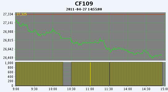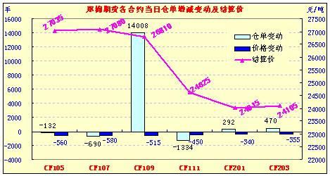 4月27日,鄭棉CF1109合約平開,盤中在空頭賣盤打壓下走低,午后創(chuàng)日低,尾盤在空頭短線回補(bǔ)支撐下反彈,日線形成陰線,日內(nèi)成交量放大,持倉(cāng)量增加。CF1109合約日成交1750796手,日增倉(cāng)14008手,終盤持倉(cāng)量386772手;CF1201合約日成交308778手,日增倉(cāng)292手,終盤持倉(cāng)量131968手?;久媲闆r:不少企業(yè)認(rèn)為當(dāng)前的市場(chǎng)形勢(shì)倍受折磨,作為原料供應(yīng)的棉花企業(yè),皮棉銷售斷檔脫節(jié),盡最大的銷售意愿依舊是價(jià)格越來越低,庫(kù)存幾乎成靜態(tài)走量;雖然不少棉企恐慌心態(tài)加劇,但在價(jià)格底線內(nèi)仍堅(jiān)持杜絕“大出血”式的銷售。而紡織企業(yè)也一樣備受承壓,一些中型的紡織企業(yè)紗線庫(kù)存較高,減產(chǎn)原料替代現(xiàn)象頻增。市場(chǎng)各方壓力均比較大。籽棉收購(gòu)方面,市場(chǎng)資源量比較少,加之前方皮棉銷售價(jià)格一路下跌,因此籽棉收購(gòu)報(bào)價(jià)繼續(xù)下降,棉廠基本已經(jīng)停收。不少企業(yè)認(rèn)為當(dāng)前市場(chǎng)弱勢(shì)難改,儼然已經(jīng)進(jìn)入了疲軟期。