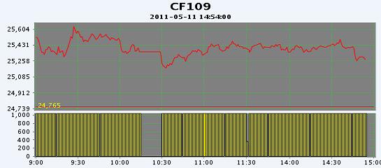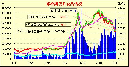 5月11日,昨日紐期上漲,近月收漲停,今日鄭棉CF1109合約高開,早盤下探后在低位承接買盤支撐下回升觸及日高,隨后受到平倉盤打壓回落,午后反彈盤整,尾盤多頭集中平倉盤的打壓下回落,日線高開陰線,日內(nèi)成交量萎縮,持倉量減少。CF1109合約日成交2618098手,日減倉41544手,終盤持倉量445664手;CF1201合約日成交289574手,日減倉16336手,終盤持倉量1130268手?;久媲闆r:現(xiàn)貨價格繼續(xù)下調(diào),市場上成交依舊無力。棉企或者棉商銷售信心繼續(xù)受挫,即便是降價出售,也鮮有成交,據(jù)信息員反饋,向來銷售較好的新疆棉,現(xiàn)在銷售也不樂觀。一些紡純棉紗的紡織廠開始轉(zhuǎn)紡滌棉紗等其他混紡;另調(diào)查了解,在剛剛結(jié)束的廣交會上90%以上是短單,而且主要是供應(yīng)商方面不想接長單,可見對后期市場走勢并不看好。而紡織服裝的成交情況仍未公布,從參展企業(yè)反映情況看,不甚樂觀。