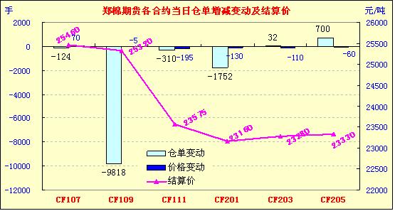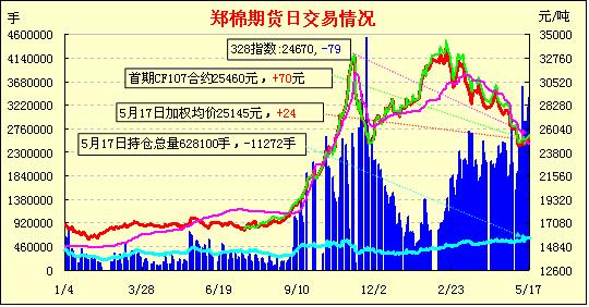 5月17日,近月收漲停,今日鄭棉CF1109合約高開,早盤在空頭賣盤打壓下走低,午前創(chuàng)日低,午后低位空頭回補推動期價反抽,此后橫向盤整,日線形成高開長下影線的陰線,日內(nèi)成交量放大,持倉量減少。CF1109合約日成交3104488手,日減倉9818手,終盤持倉量464952手;CF1201合約日成交268584手,日減倉1752手,終盤持倉量133354手?;久媲闆r:現(xiàn)貨價格繼續(xù)下跌,市場觀望情緒濃厚,棉紗銷售依舊不暢,紡織企業(yè)用棉意愿下降,市場成交無變化。有個別的軋花廠在收購,但是數(shù)量有限且對質(zhì)量掌控嚴格。電子盤在24000元/噸一線的時候得到支撐,今日國內(nèi)兩個電子盤主力合約紛紛大幅反彈,多頭活動明顯。