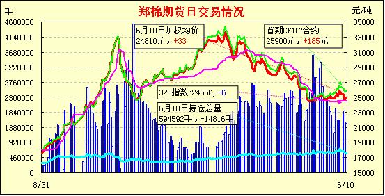 6月10日,鄭棉CF1109合約高開,早盤慣性沖高后在多頭平倉盤打壓下走低,午前反復(fù)震蕩,午后受到多頭持續(xù)平倉壓制盤跌下行,日線形成高開陰線星,日內(nèi)成交量萎縮,持倉量減少;鄭棉CF1201合約高開,早盤在多頭買盤推動(dòng)下沖高午間調(diào)整,午后在周末平倉盤的影響下走低盤整,日線形成高開陽線星,日內(nèi)成交量溫和放大,持倉量減少。CF1109合約日成交227916手,日減倉9592手,終盤持倉量287554手;CF1201合約日成交1261128手,日減倉4972手,終盤持倉量271510手?;久媲闆r:棉花銷售依舊不動(dòng),雖然有紡織廠在采購,但是量小,壓價(jià)低,實(shí)質(zhì)現(xiàn)貨價(jià)格仍在暗暗下跌。據(jù)反饋,山東魏橋紡織下調(diào)其紗線報(bào)價(jià),在紗線價(jià)格頻頻下跌的過程中紡織廠已經(jīng)從忍痛降價(jià)到麻木降價(jià)。 對(duì)于后期的棉花市場(chǎng)走勢(shì),多數(shù)被調(diào)查紡織企業(yè)持觀望心態(tài),認(rèn)為主要還是看下游的銷售情況,如果紡織廠持續(xù)“消化不良”,對(duì)于棉花等紡織原料的采購肯定還是難以啟動(dòng)。